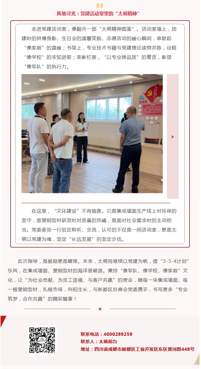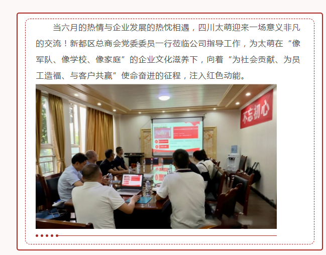 【概要描述】當六月的熱情與企業發展的熱忱相遇,四川太萌迎來一場意義非凡的交流!新都區總商會黨委委員一行蒞臨公司指導工作,為太萌在“像軍隊、像學校、像家庭”的企業文化滋養下,向著“為社會貢獻、為員工造福、與客戶共贏”使命奮進的征程,注入紅色動能。