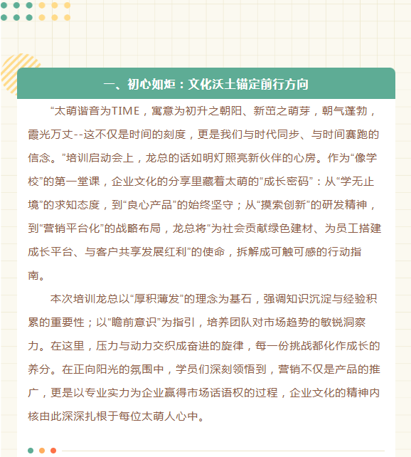 七月的風裹挾著成長的熱忱,四川太萌的會議室里暖意涌動。為期三天的新進營銷人員培訓,既是一場“萌新”融入團隊的“破冰之旅”,更是一次踐行“像家庭、像學校、像軍隊”企業文化的生動實踐。從企業文化的浸潤到產品知識的深耕,從銷售技能的打磨到規章制度的踐行,太萌以“創新、專業、正向、陽光”的姿態,為新伙伴鋪就了一條“為社會貢獻、為員工造福、與客戶共贏”的成長之路。