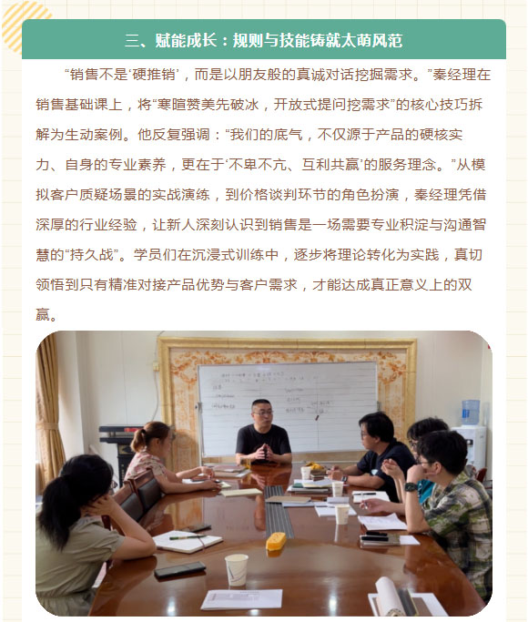 【概要描述】 圖片 七月的風裹挾著成長的熱忱,四川太萌的會議室里暖意涌動。為期三天的新進營銷人員培訓,既是一場“萌新”融入團隊的“破冰之旅”,更是一次踐行“像家庭、像學校、像軍隊”企業文化的生動實踐。從企業文化的浸潤到產品知識的深耕,從銷售技能的打磨到規章制度的踐行,太萌以“創新、專業、正向、陽光”的姿態,為新伙伴鋪就了一條“為社會貢獻、為員工造福、與客戶共贏”的成長之路。