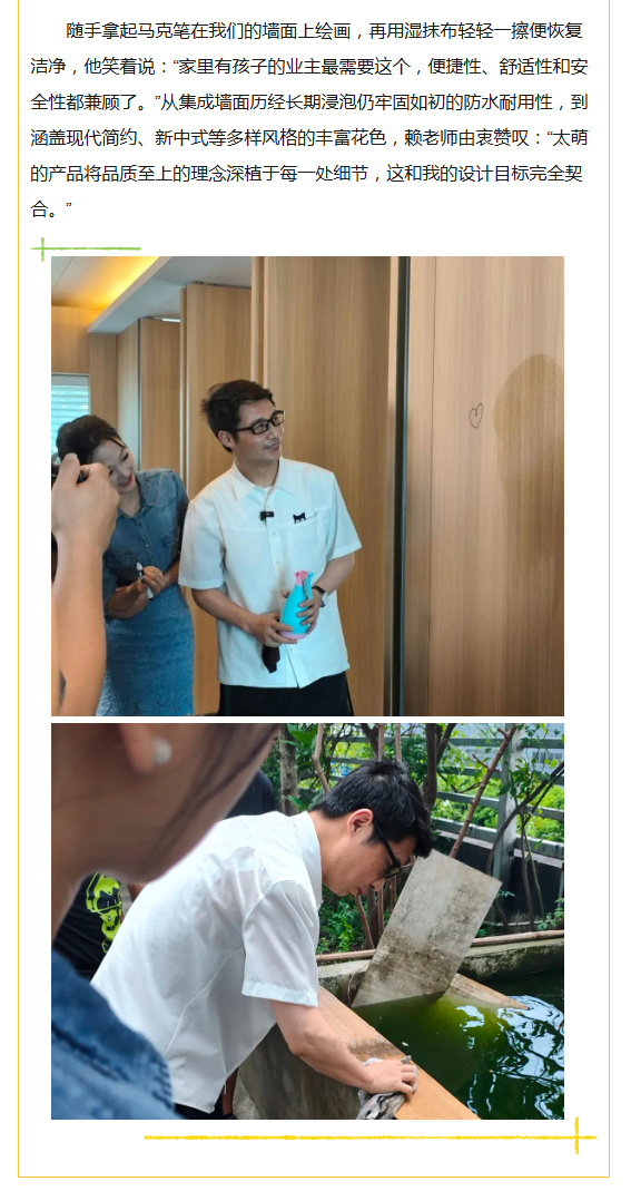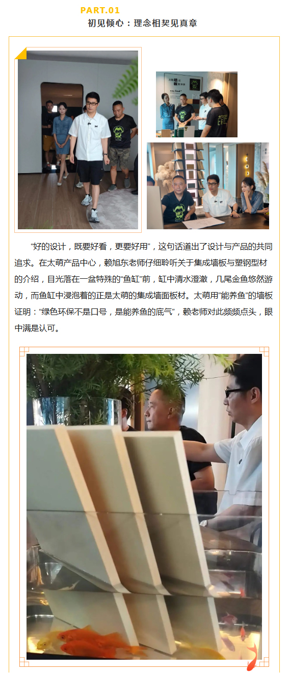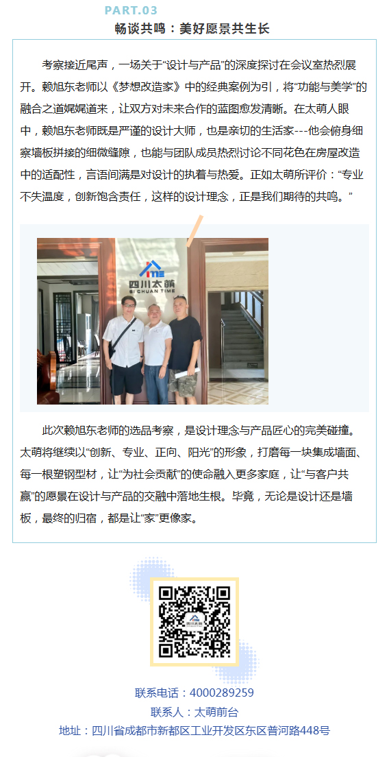 當八一軍旗在晨光中烈烈翻飛,四川太萌以“像軍隊、像學校、像家庭”的文化底色,與全體員工共慶建軍佳節。從軍人的鐵血擔當到企業的初心使命,從“有令必行”的紀律性到“戰之必勝”的執行力,太萌將軍旅精神融入每一塊集成墻面、每一根塑鋼型材,在“為社會貢獻、為員工造福、與客戶共贏”的道路上,續寫著屬于新時代企業的“強軍”篇章。 詳細>> - 匠心相遇,共筑美好|《夢想改造家》賴旭東老師一行蒞臨太萌選品考察 2025-07-30