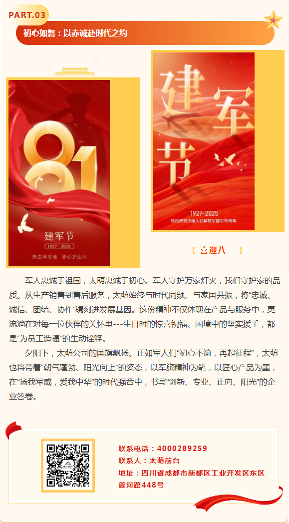 【概要描述】當八一軍旗在晨光中烈烈翻飛,四川太萌以“像軍隊、像學校、像家庭”的文化底色,與全體員工共慶建軍佳節。從軍人的鐵血擔當到企業的初心使命,從“有令必行”的紀律性到“戰之必勝”的執行力,太萌將軍旅精神融入每一塊集成墻面、每一根塑鋼型材,在“為社會貢獻、為員工造福、與客戶共贏”的道路上,續寫著屬于新時代企業的“強軍”篇章。
