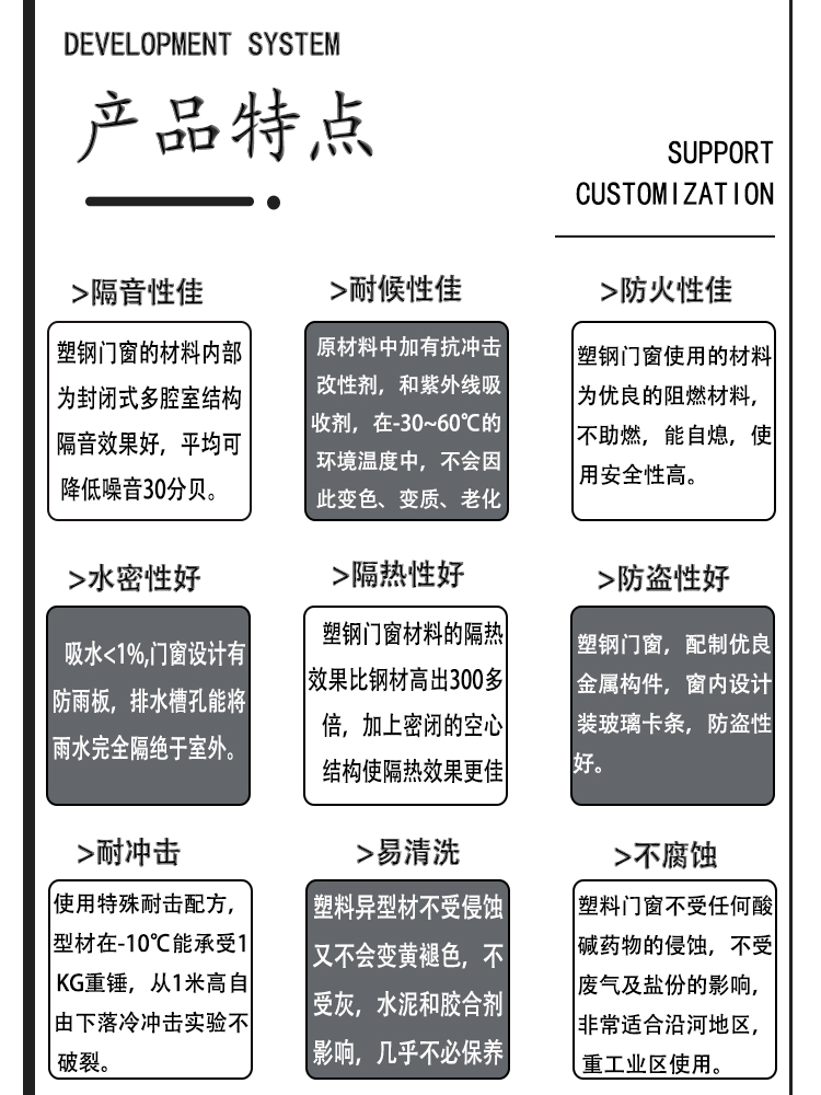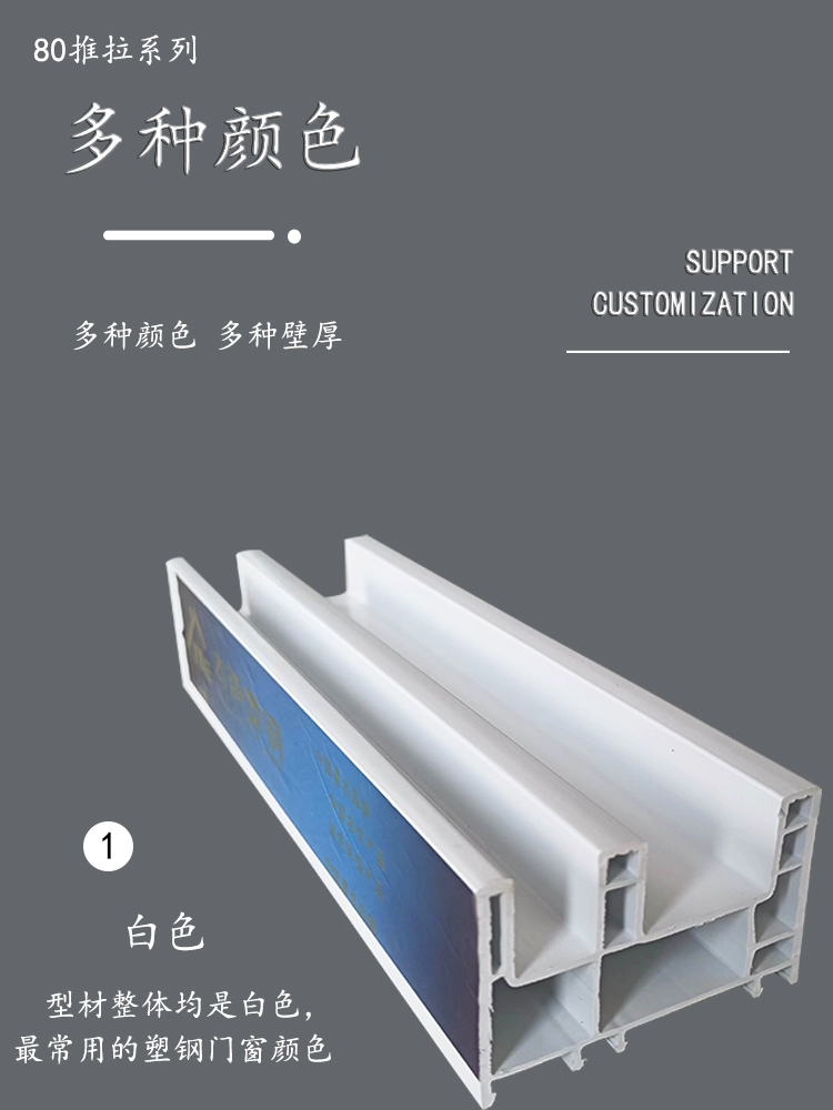 公司開發(fā)生產(chǎn)的塑鋼型材現(xiàn)有60平開和推拉系列、80推拉系列、88推拉系列,可制作固定、內(nèi)外平開、推拉、上懸窗、下懸窗、百葉窗等,品種規(guī)格齊全。采用新技術、新配方,確保產(chǎn)品色澤一致,以及采用先進焊接平整工藝,使結(jié)構更堅固、質(zhì)量更放心。本系列產(chǎn)品是以塑代木、代鋼、代鋁的“第四代門窗”,具有防火阻燃、耐腐蝕、隔音隔熱、外觀精美、品種新穎、不易老化、不易褪色、清洗方便等特點。主要顏色有白色、灰色、咖啡色等,可根據(jù)居室裝飾的特點確保協(xié)調(diào)一致,使你家居生活更顯示尊貴。產(chǎn)品適用于賓館、辦公樓、家裝門窗使用,為同類產(chǎn)品之精品。